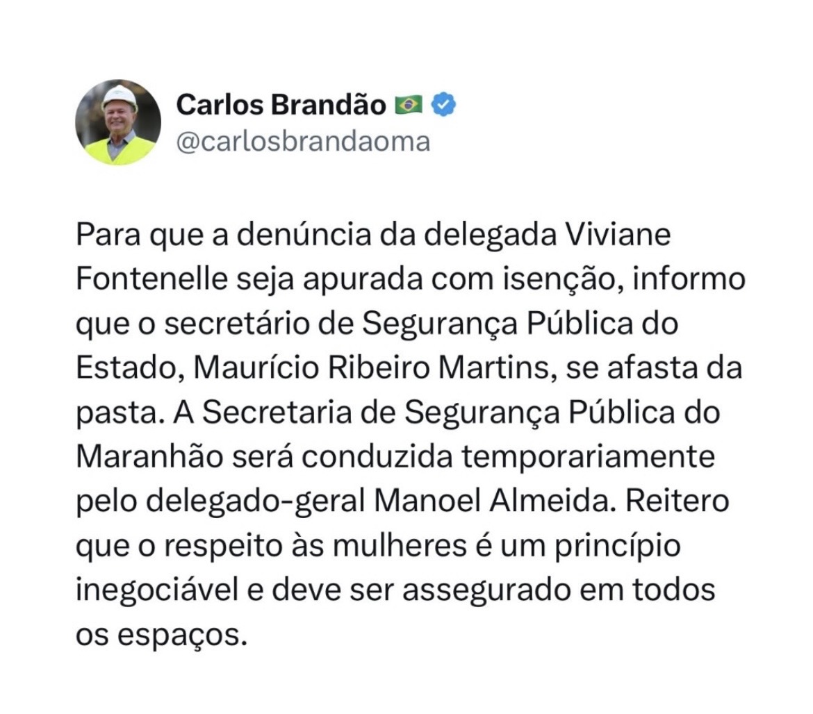 O governador do Maranhão, Carlos Brandão, determinou nesta quarta-feira (11) o afastamento do secretário de Segurança Pública do estado, Maurício Ribeiro Martins, após uma denúncia de assédio feita pela delegada da Polícia Civil Viviane Fontenelle.